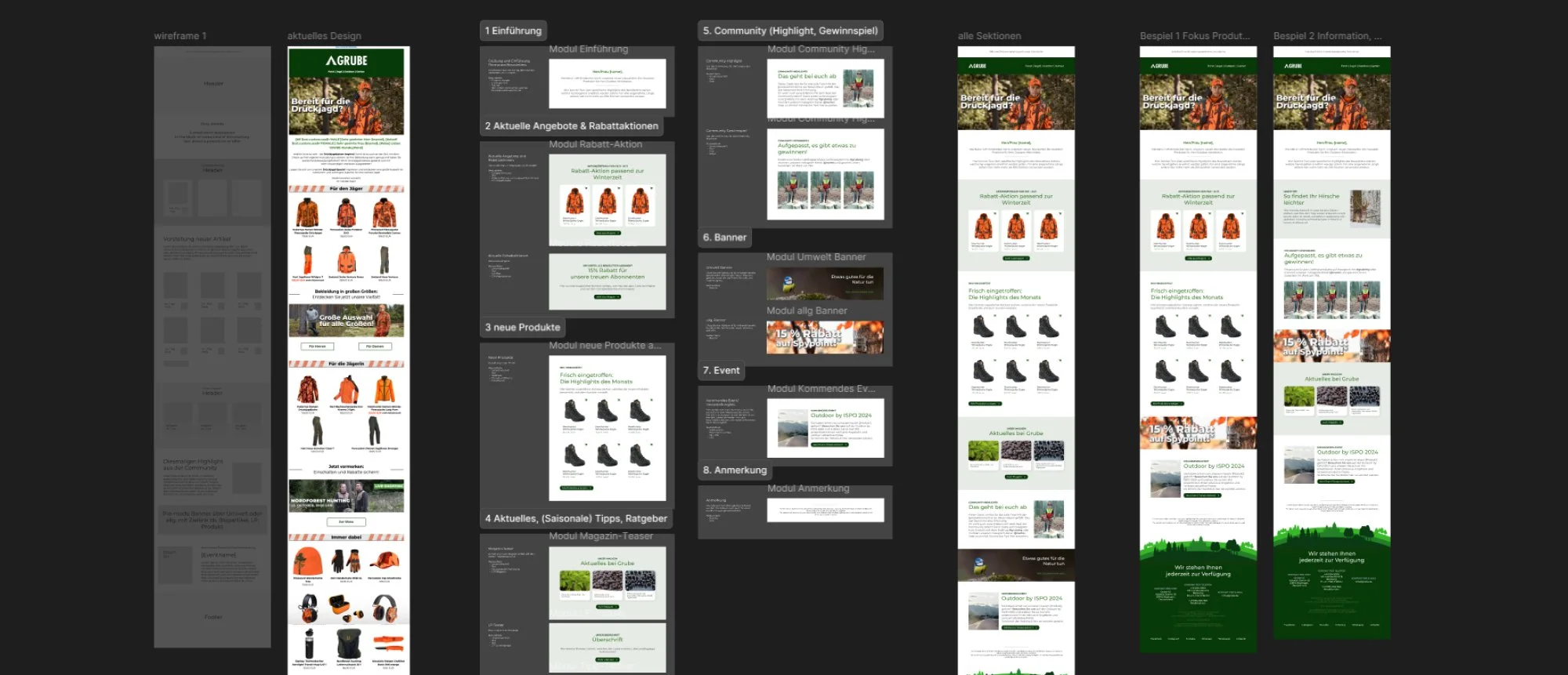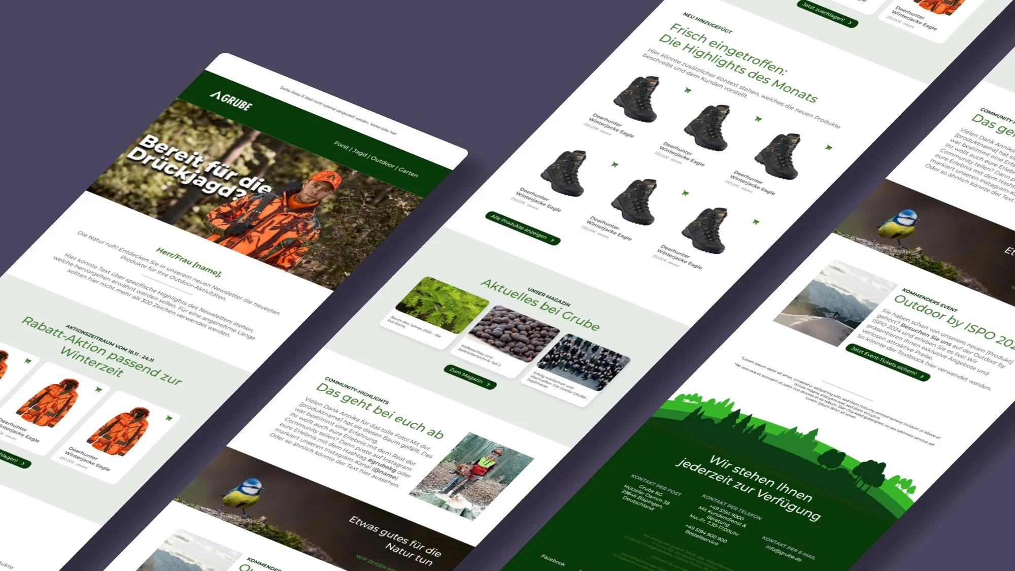 Für den Online-Shop von GRUBE, einem europäischen Fachhändler für Jagd-, Forst- und Outdoor-Ausrüstung, wurde das Layout der Newsletter-Kommunikation neu gestaltet. Ziel des Projekts war es, die visuelle Struktur der E-Mails zu modernisieren, Inhalte klarer aufzubereiten und Marketingaktionen sowie Produktempfehlungen übersichtlicher darzustellen.